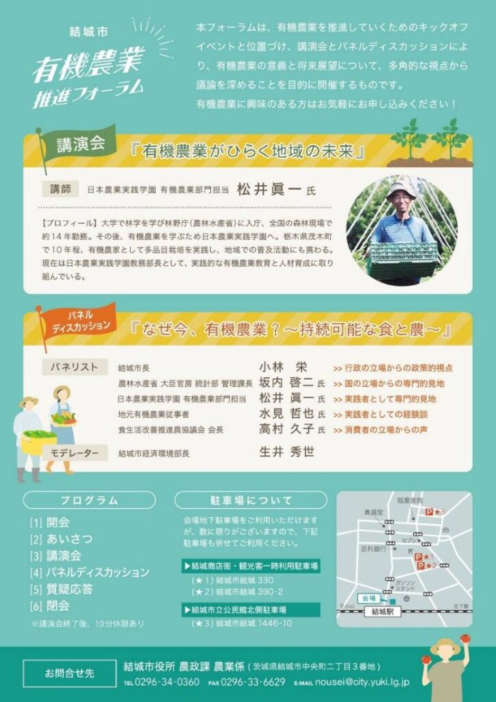 「結城ではじめる、有機なゆうき」。有機農業推進フォーラムが2026年2月7日(土)午後1時半から、茨城県結城市国府町の石島建設プラネットホール・ゆうき図書館(市民情報センター3階多目的ホール)で開かれます。