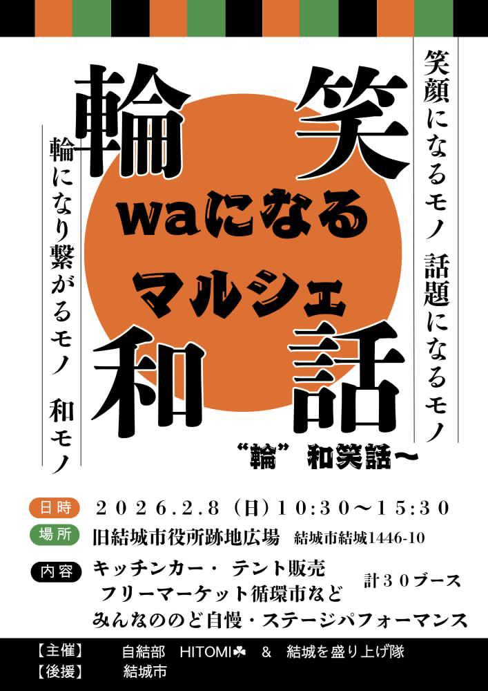 「わ(輪、和、話、笑)」をテーマに交流し輪を広げるイベント「waになるマルシェ」が2026年2月8日(日)午前10時半から午後3時半まで、茨城県結城市結城の旧市役所跡地広場で開催されます。