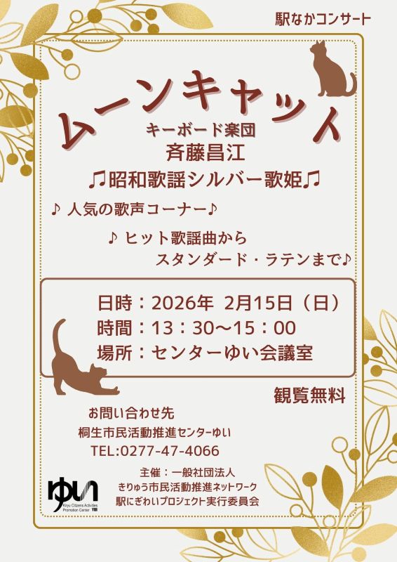 きりゅう市民活動推進ネットワークが主催する2月の「駅なかコンサート」と「寺子屋ゆい」を紹介します。