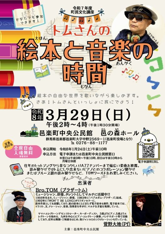 ミュージシャンのブラザートムさんが群馬県邑楽町にやってきます!邑楽町中央公民館主催の町民文化講座「トムさんの絵本と音楽の時間」が3月29日、邑楽町中央公民館・邑の森ホールで開かれます。なんと入場無料!町外の人も参加OKです。