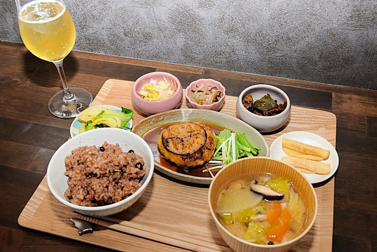 ご飯は、小豆と玄米を炊いて3日間保温発酵させた「寝かせ(酵素)玄米」。もちもちの食感で栄養価もプラス。メイン料理と煮物、あえ物、漬物などの副菜5種に具だくさんのみそ汁と飲み物がセットです。ある日のメインは「れんこん入りつくね」。