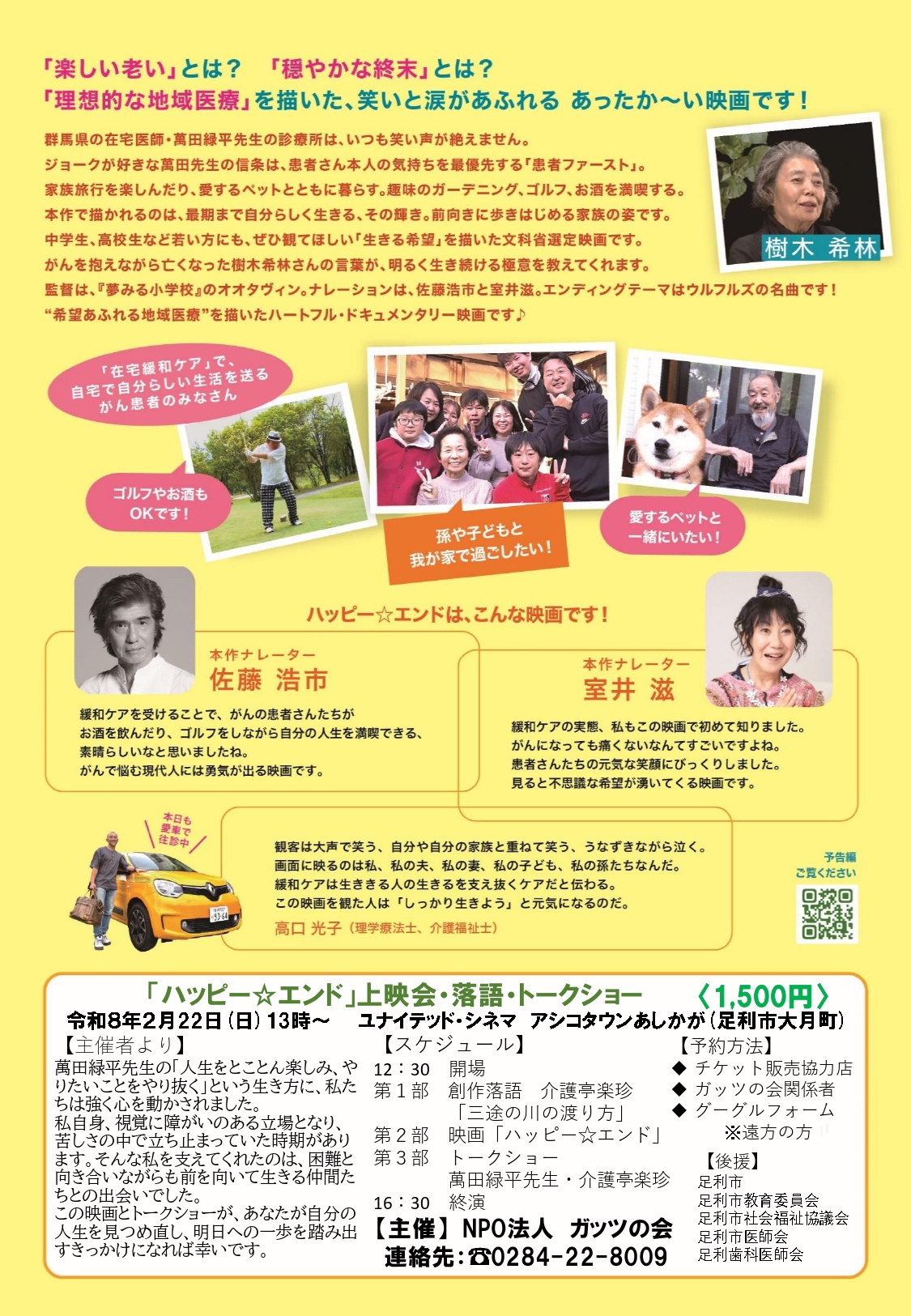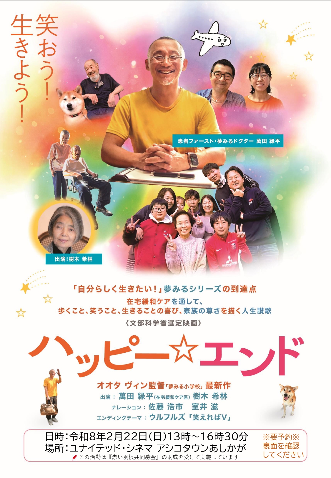栃木県足利市の映画館「ユナイテッド・シネマ アシコタウンあしかが」で2月22日(日)、在宅緩和ケアを通じたさまざまな家族の姿を映したドキュメンタリー映画「ハッピー☆エンド」の上映会が行われます。主役である医師の萬田縁平さんによるトークショーもあり、現在チケット販売中です。