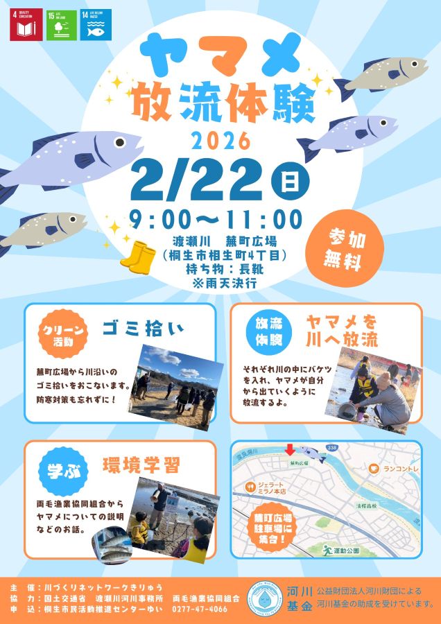 川をきれいにして命の大切さを学ぶ「ヤマメ放流体験2026」が2月22日、群馬県桐生市の蕪町広場と渡良瀬川で開催されます。