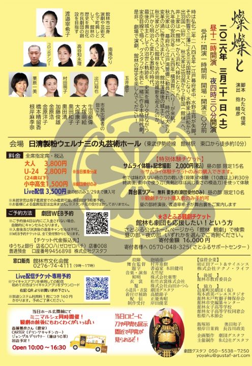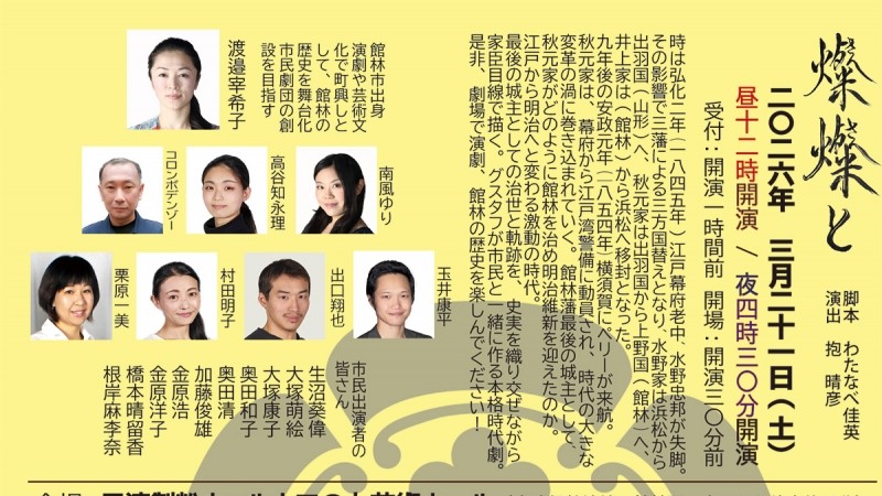 最後の館林藩主・秋元家を描いた本格時代劇「燦燦と」が3月21日に、群馬県館林市の日清製粉ウェルナ三の丸芸術ホールで開かれます。秋元家がどのように館林を治め、明治維新を迎えたのかを、史実を織り交ぜながら家臣の目線で描きます。