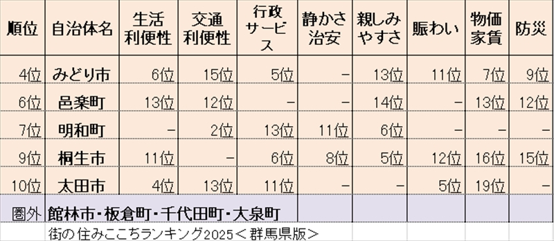 県庁所在地の前橋市(3位)に続いて住みやすさが評価されているみどり市。生活利便性の高さや行政サービスの充実、物価や家賃が比較的安い点も魅力です。