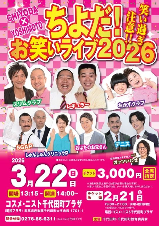 よしもと芸人が大集合する「ちよだ!お笑いライブ2026」が3月22日、群馬県千代田町のコスメ・ニスト千代田町プラザで開かれます。