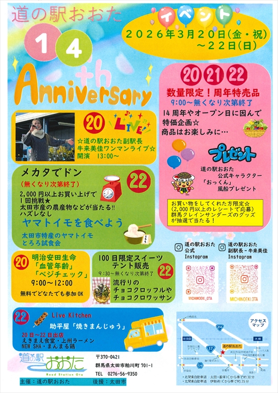 群馬県太田市の「道の駅おおた」のオープン14周年記念イベントが、20~22日の3日間にわたって開かれます。