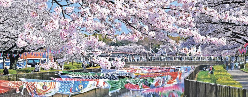 館林市中心部を流れる鶴生田川両岸では、ソメイヨシノ約160本と掲揚されたこいのぼりとの共演を楽しめます(3月29日撮影)。