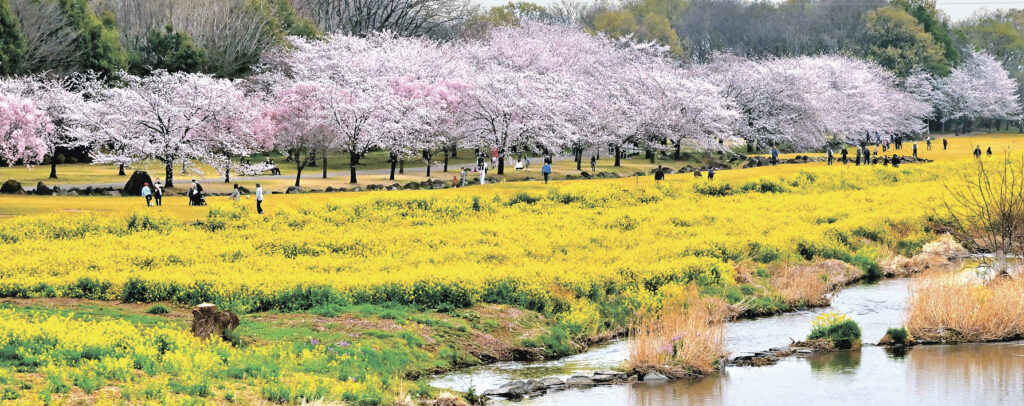 少し足を延ばして伊勢崎市内の桜はいかがでしょう。ラブリバーうぬきハマサカパーク(ラブリバー親水公園うぬき)では、菜の花とソメイヨシノが咲き誇り、 黄色と薄ピンク色のコントラストを生み出しています(30日撮影)。