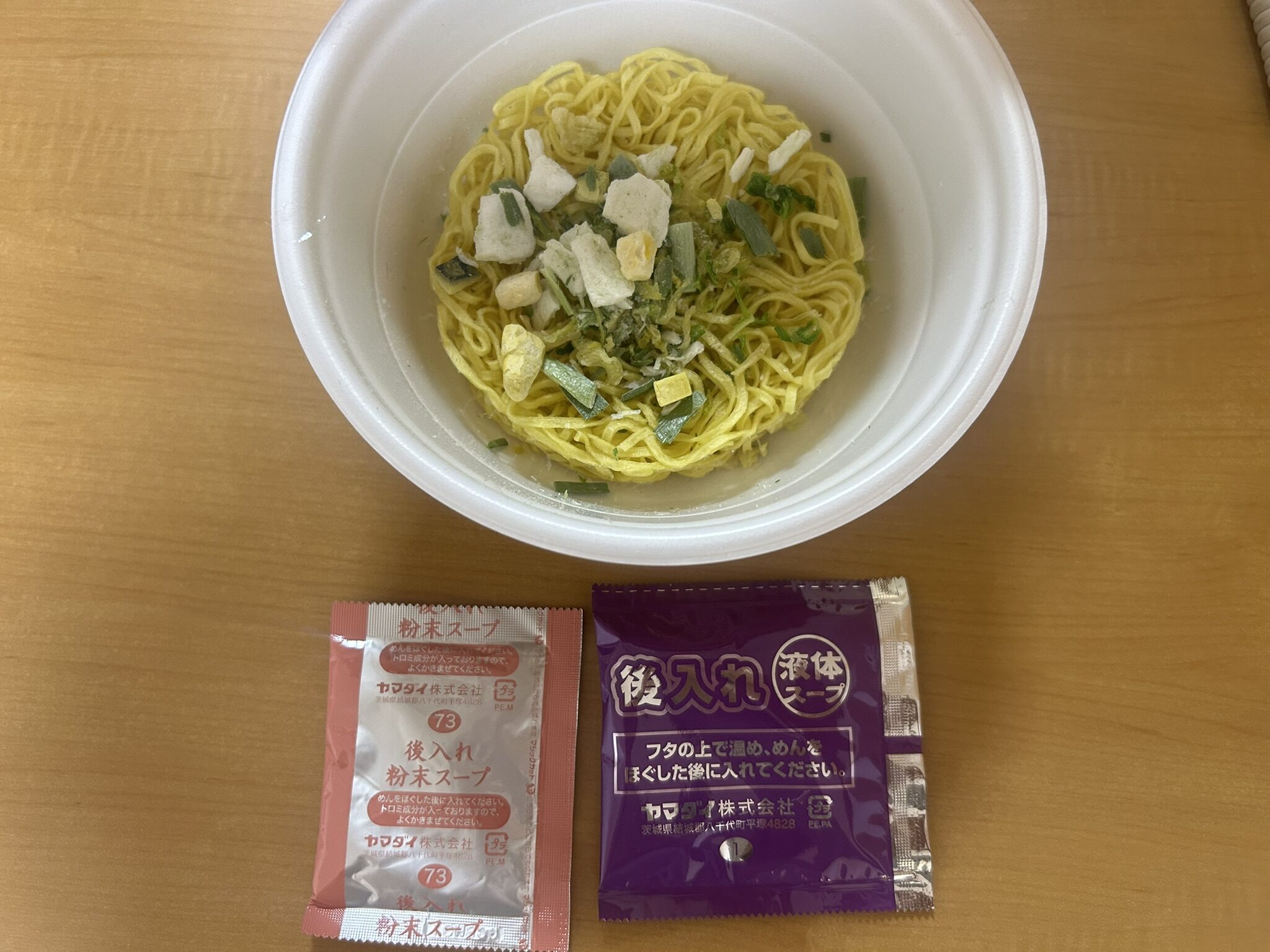 かやくを入れてお湯を注ぎ、5分。仕上げに2種類のスープを入れて、完成です。