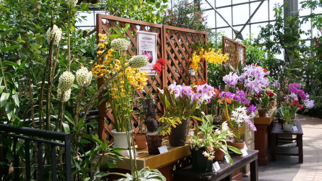 先日まで開催された洋ラン展に続いて「つくば洋蘭会」の愛好家の方が育てた、珍しい洋ランの展示も行われています。花の形がやや毒々しいもの、根が鉢の外に露出しているものもあり、その多様さに驚かされます。