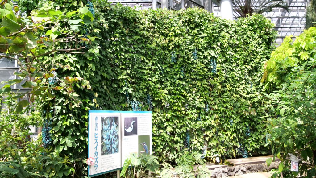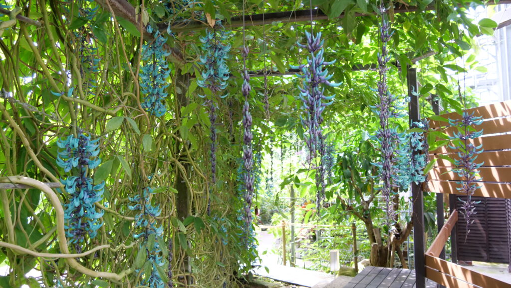 とちぎ花センターの鑑賞大温室「とちはなちゃんドーム」には高さ3~4mのヒスイカズラの壁があり、その緑に紛れるように、ヒスイカズラの房がぶら下がっています。