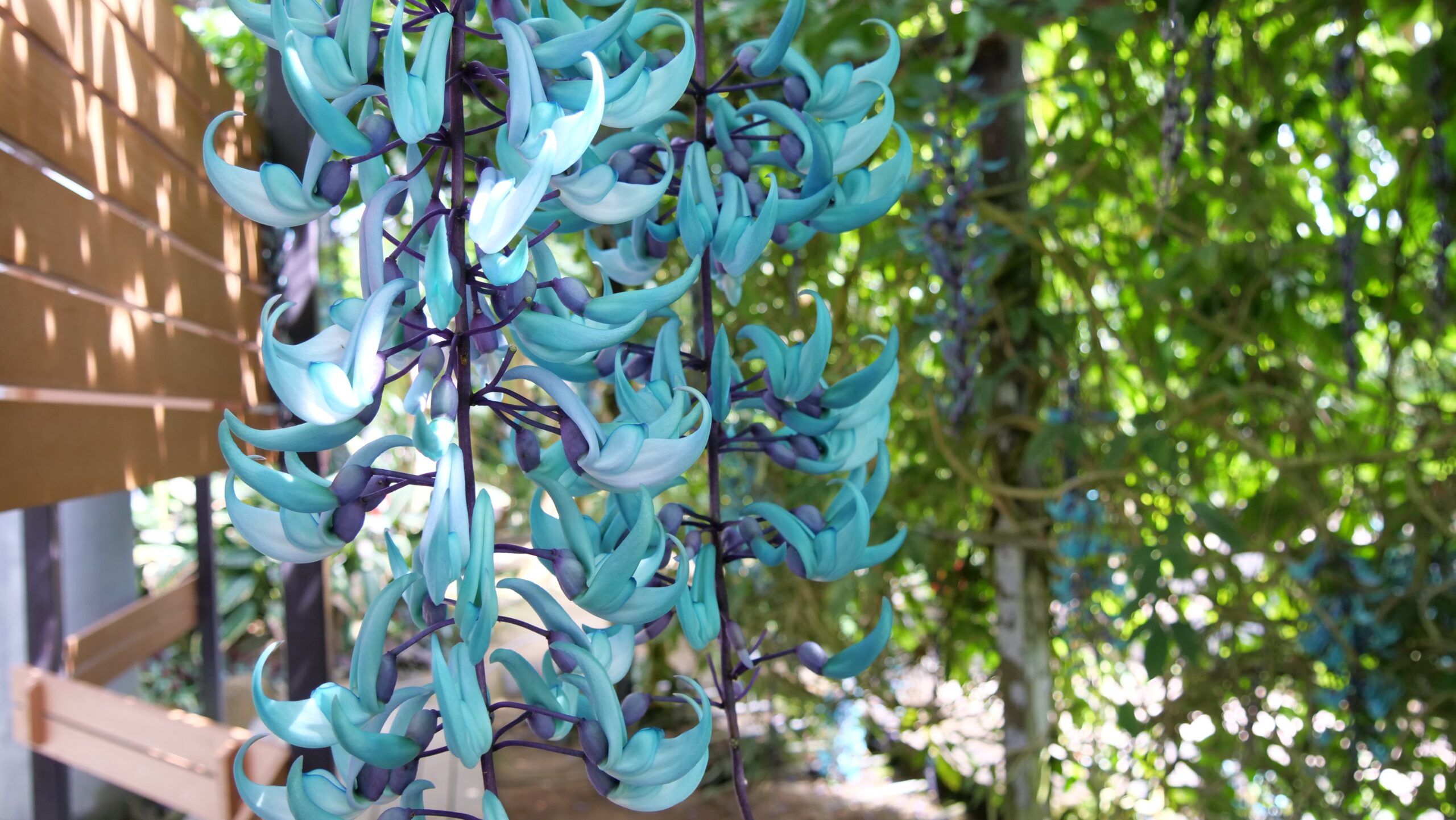 壁の周辺にはぐるりと回れる通路があり、裏側に行くとそこには“青のシャンデリア”が…!。昨年も開花時期に足を運びましたが、ここまでの光景は見られませんでした。