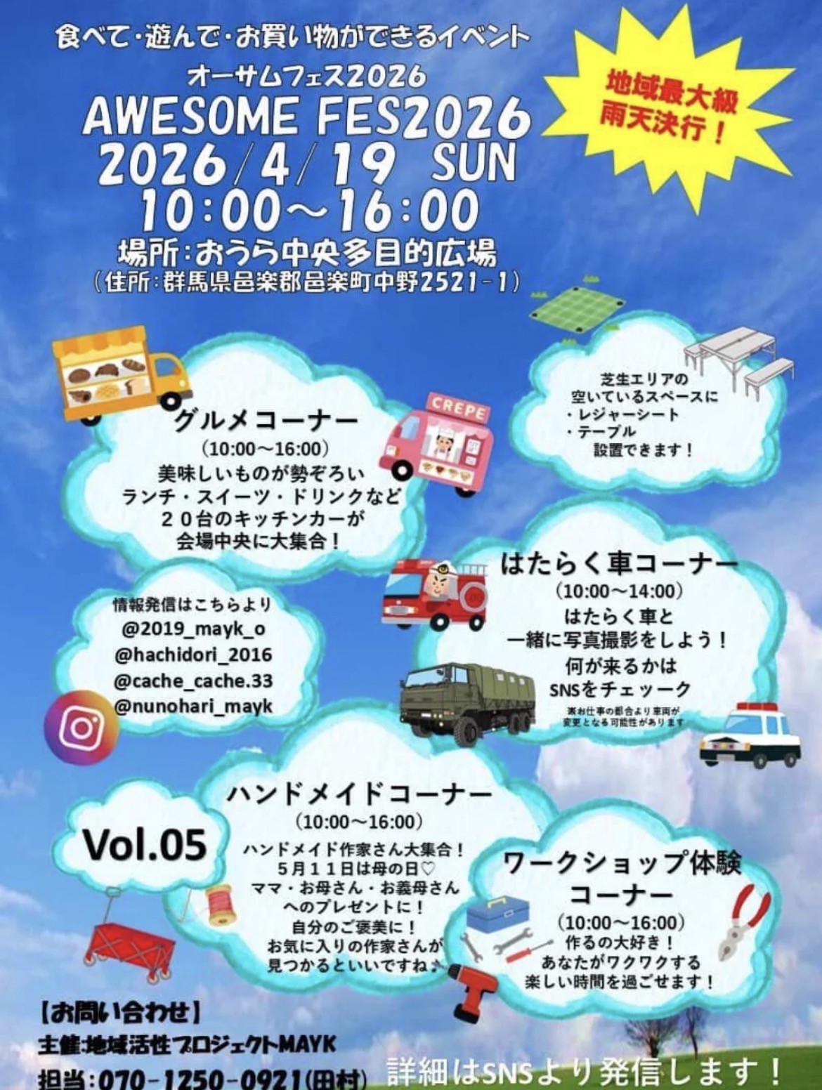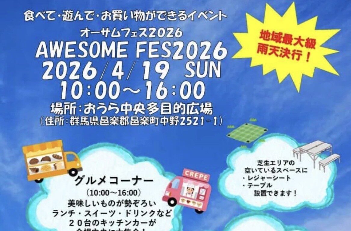 おいしいグルメ、ハンドメード作品の販売、ワークショップなどが楽しめるイベント「オーサムフェス2026」が4月19日、群馬県邑楽町のおうら中央多目的広場で開かれます。