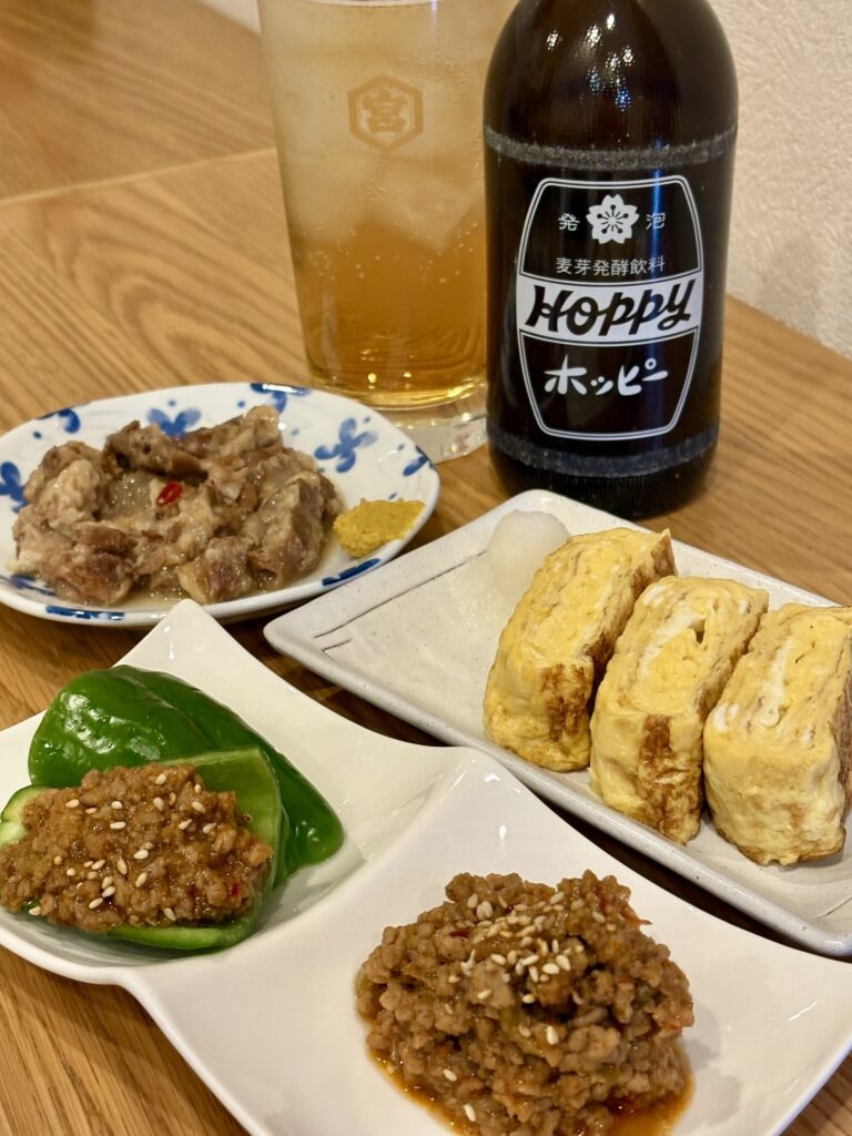 肉みそ生ピーマンや皿なんこつ(奥)などいろいろなメニューが楽しめます