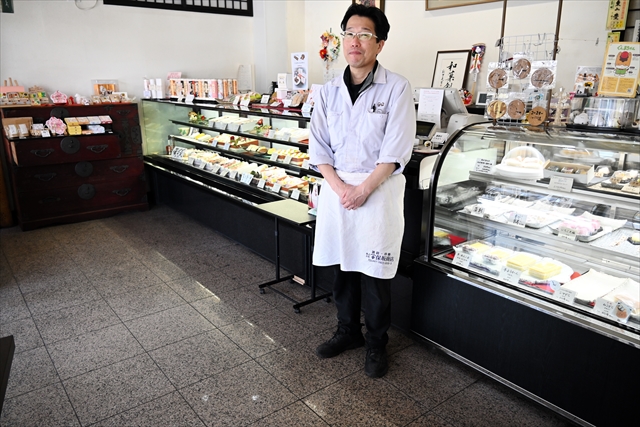 4代目の東山さんと定番の品から四季折々の和菓子が並ぶ店内