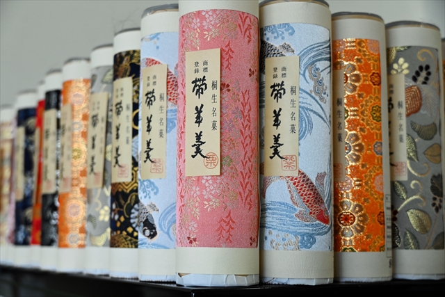 豪華できらびやかな金襴(きんらん)でラッピングした「帯羊羹(おびようかん)」(1350円)は、織都桐生らしい逸品です。