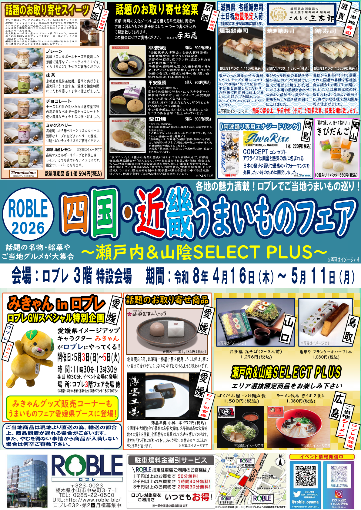 JR小山駅西口のロブレ(栃木県小山市)でご当地物産展「四国・近畿うまいものフェア」が開催されています。高知が誇るカツオの藁焼きたたき、ロブレ初登場となる大阪のなめらかティラミスなど垂涎ものの注目商品が集結。5月11日(月)までです。