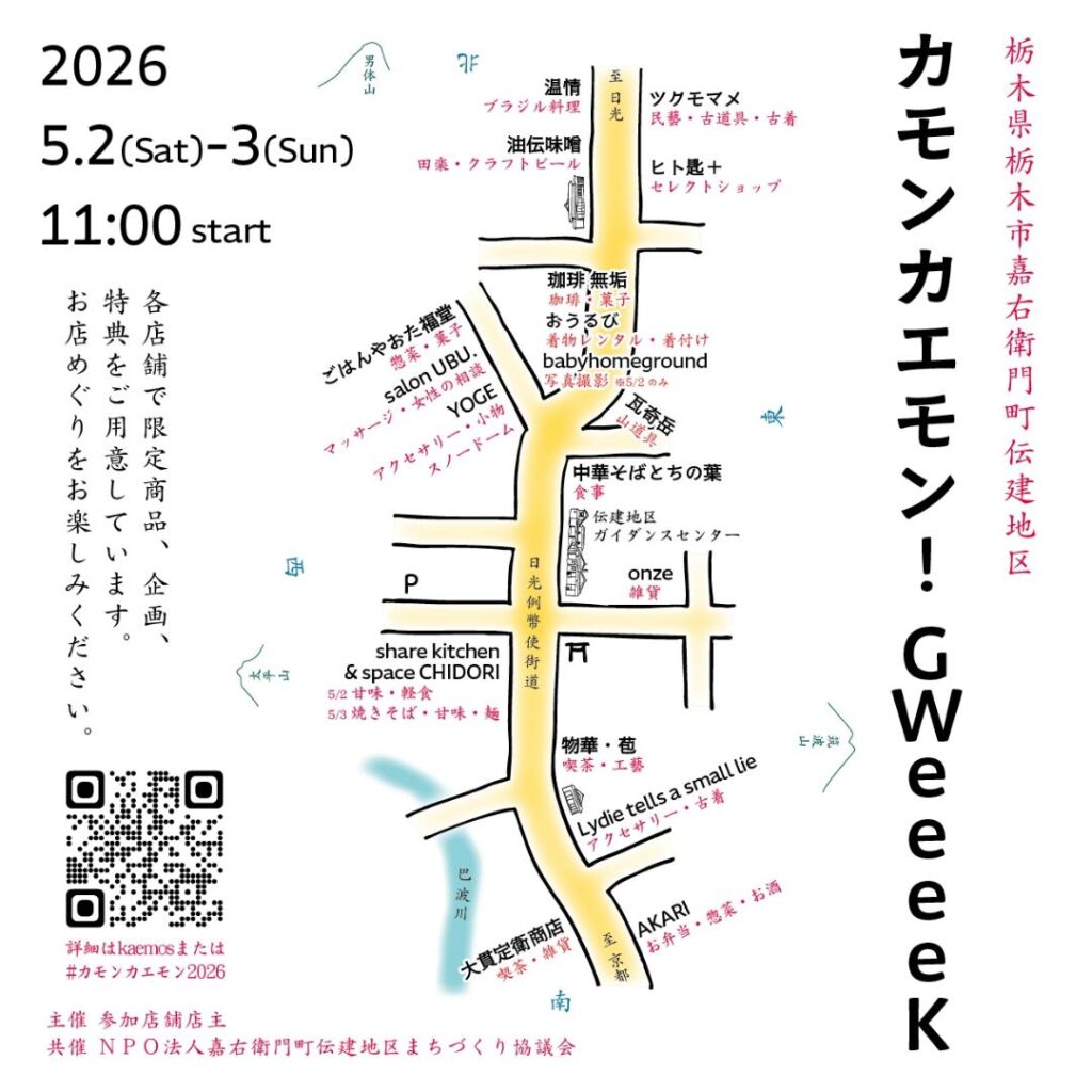 歴史的な街並みが残る栃木県栃木市の嘉右衛門町地区で、5月2日(土)~3日(日)の2日間、地区内のお店が限定メニューや特別企画を展開する「カモンカエモン!GWeeeeK」が開催されます。5連休となるゴールデンウィーク(GW)後半戦の幕開けにぴったりなイベントの参加店舗などについてお伝えします。