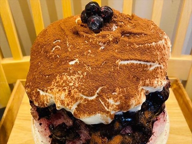 メニュー「ブルーベリーティラミス」(1500円)には自家製のブルーベリーソース、クッキー、深煎りコーヒーのソースなどが入り、ちょっぴり大人な味わい。