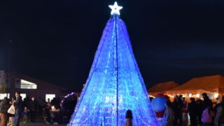 五霞町 ペットボトルのクリスマスツリーお目見え 約4000本つなぐ 鮮やかな青い光が楽しめます 道の駅ごか 五霞町